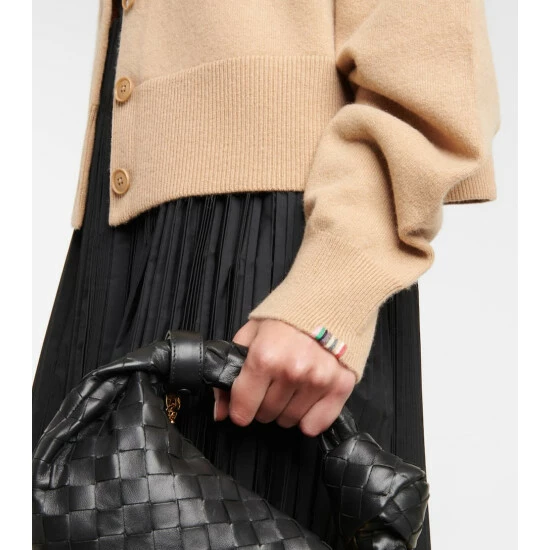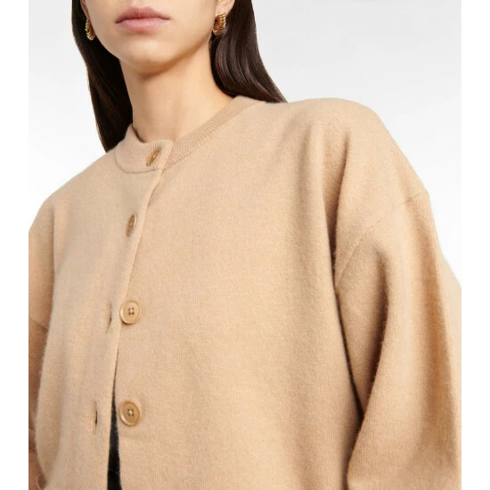 The beige N°170 Chou cardigan from Extreme Cashmere is knitted from the brand’s signature cashmere-blend yarn. It features a crew neckline, tonal buttons, and ribbed trims.