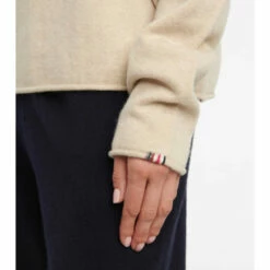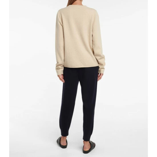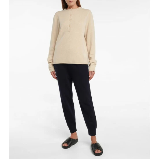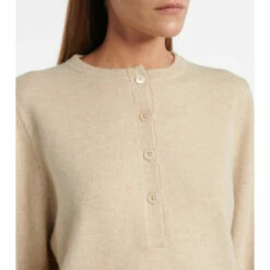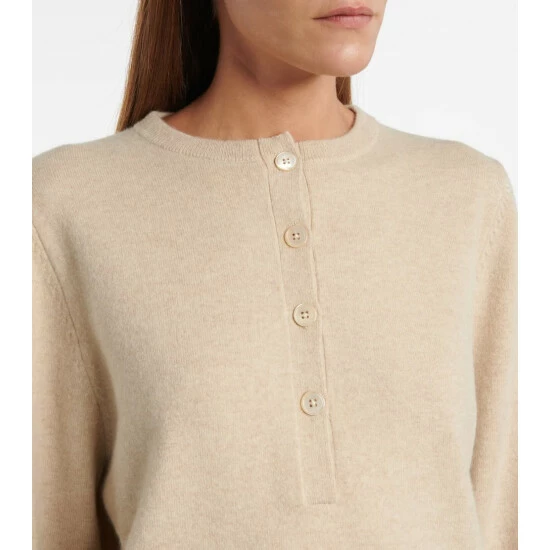 The beige N°183 Be Loved sweater from Extreme Cashmere is made from the label’s signature cashmere-blend knit. It features a crewneck and a partially buttoned front.