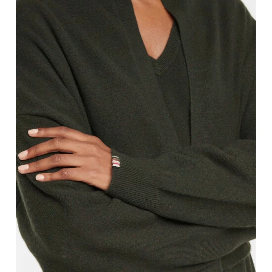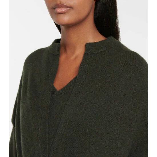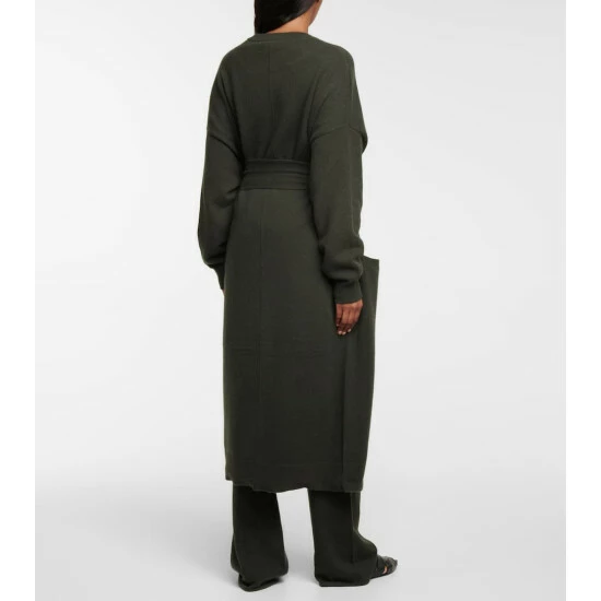 The green N°186 Marina cardigan from extreme cashmere is made from the label’s signature cashmere-blend knit. It features a self-tie waist and patch pockets.
