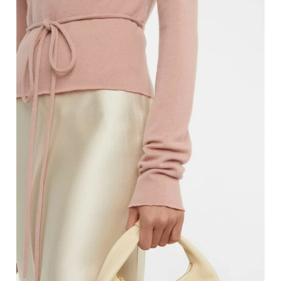 Update your capsule with the chic N°202 Minus sweater from Extreme Cashmere. It’s made from a pink cashmere-blend with elongated sleeves, raw-edge trims and a removable self-tie belt.