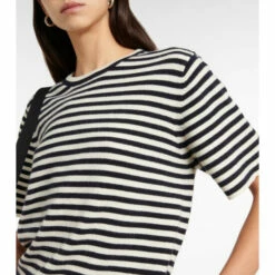 The N°64 Tshirt top from Extreme Cashmere is knitted from the brand’s signature cashmere-blend yarn. This striped design has a crew neckline, a relaxed cut, and rolled edge details.