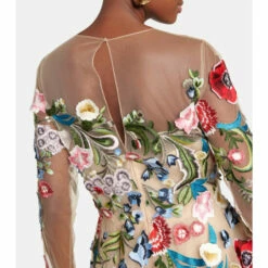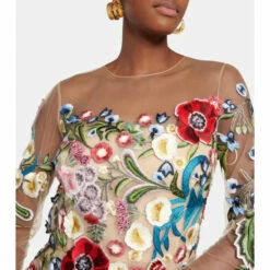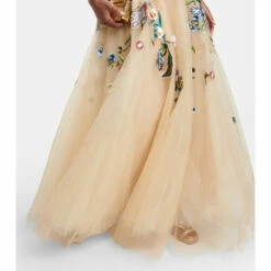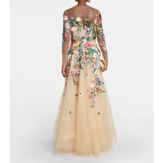 Oscar de la Renta’s cinematic vision defines this layered tulle gown. Appearing with a mesh bodice that’s intricately embroidered with floral appliquĂ©, this piece is lined with silk and has a full-length layered skirt.