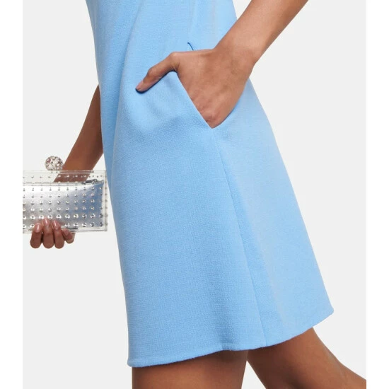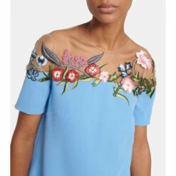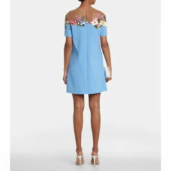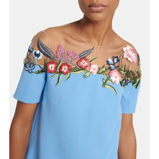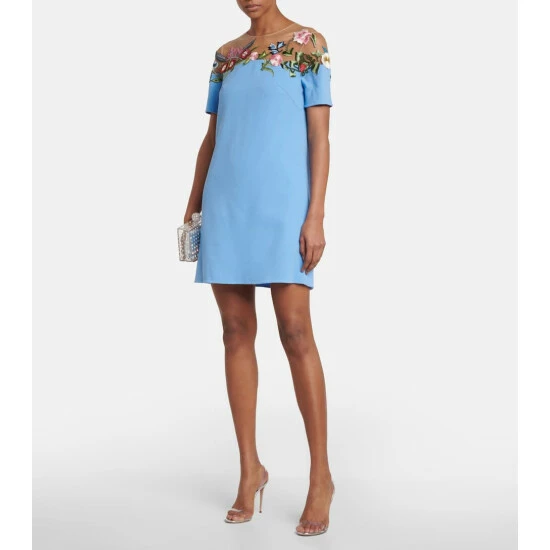 This design from Oscar de la Renta is made in Italy from a wool-blend to a mini silhouette. The short-sleeved design has a sheer upper panel framed by embroidered floral detailing that creates an off-shoulder effect.