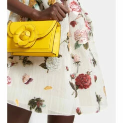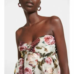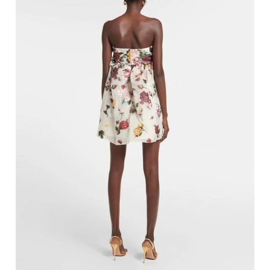 This strapless minidress from Oscar de la Renta is made from frothy fil coupé and adorned with embroidered roses. It has a twisted bandeau bodice and a voluminous skirt with silk lining.