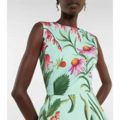 In true Oscar de la Renta style, this midi dress is enriched with a romantic botanical motif. It has a structured silhouette with an elegant high neckline, cinched waist, and a voluminous skirt.