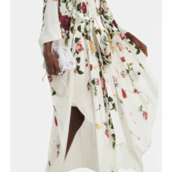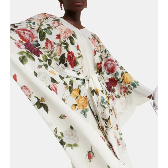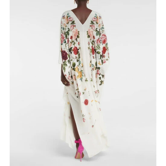 This gown from Oscar de la Renta borrows from loose caftan styles. It’s made from pure silk crêpe with a degradé rose print and features a deep V-neckline and a self-tie waist belt.
