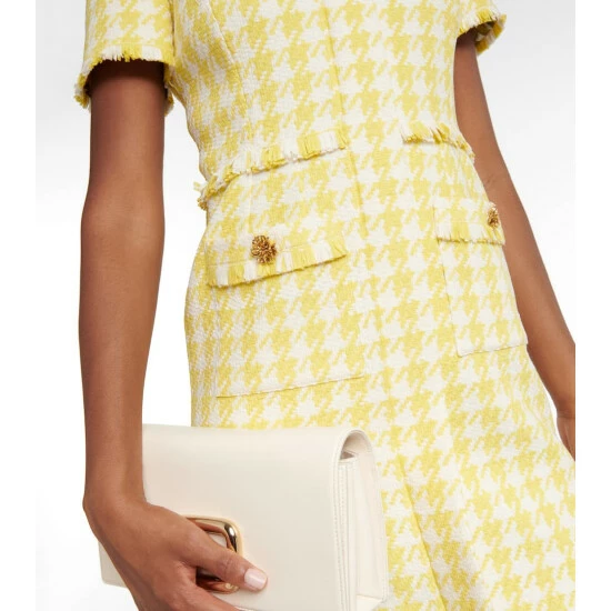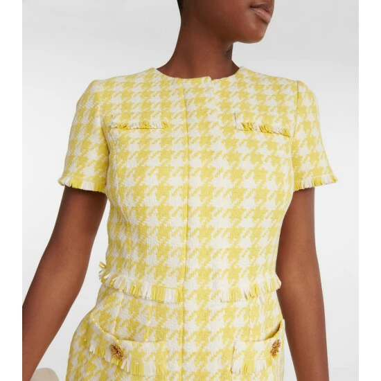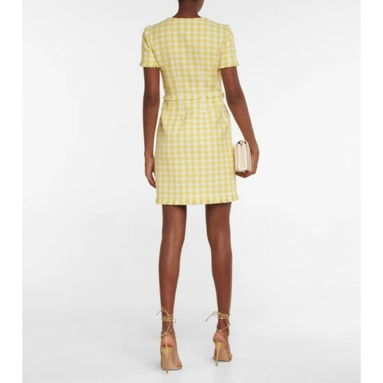 We envision this Oscar de la Renta minidress being worn both to the office and to luncheons. Made in Italy from gingham tweed, it has short sleeves, fringe trim, and a nipped-in waist.