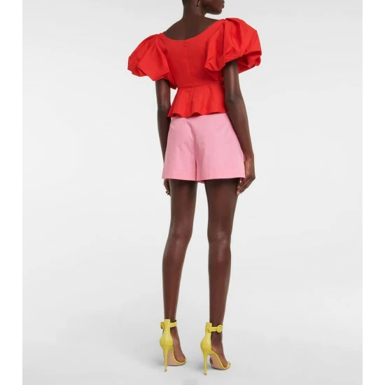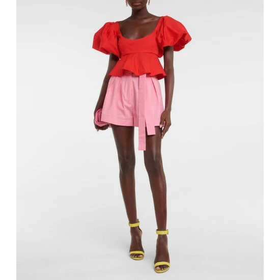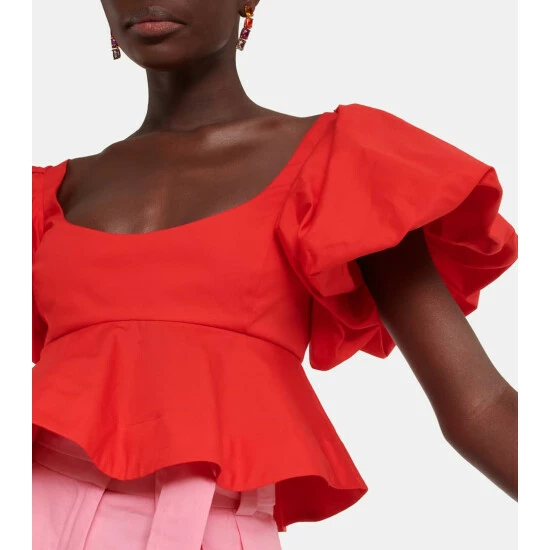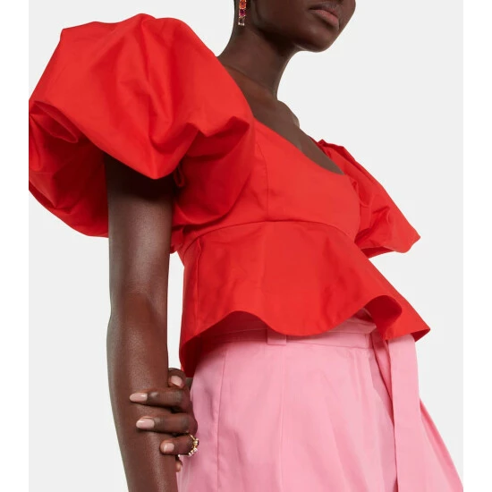 Crisp cotton is Oscar de la Renta’s fabric of choice for the design of this sculptural crop top. The scarlet red design features a deep scoop neckline, billowing puff sleeves, and a peplum waist panel that’s cut on bias.