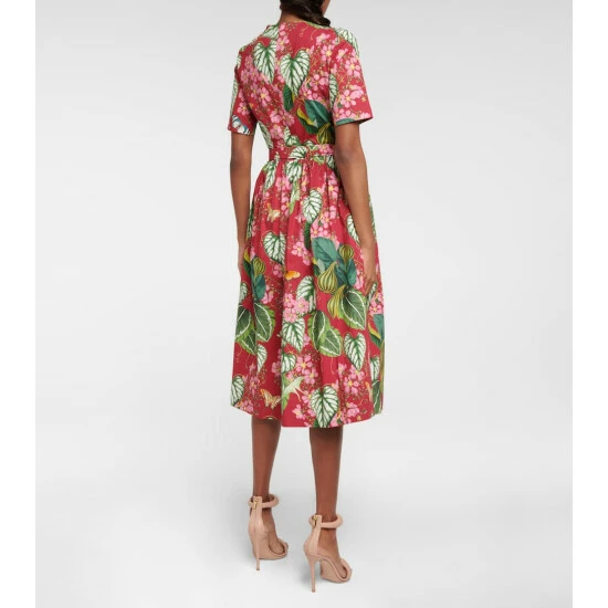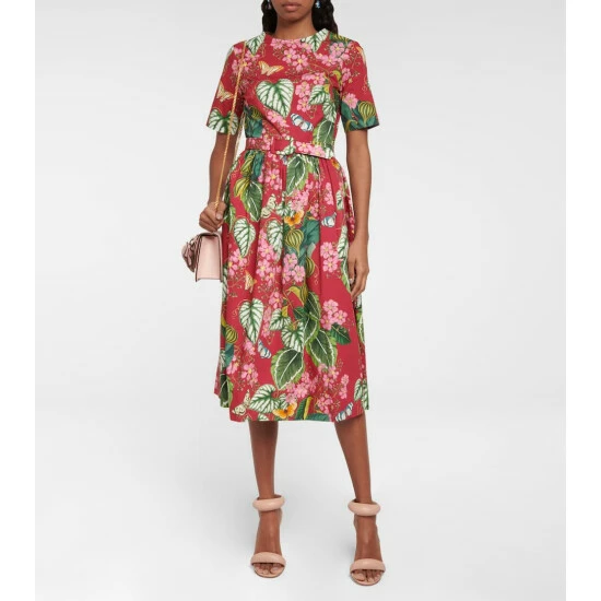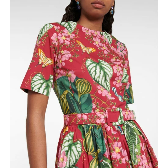 This dress from Oscar de la Renta is made from cotton-blend poplin in a vibrant botanical print. This red design has a flared midi skirt, a round neckline, and a matching waist belt.