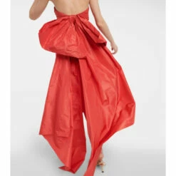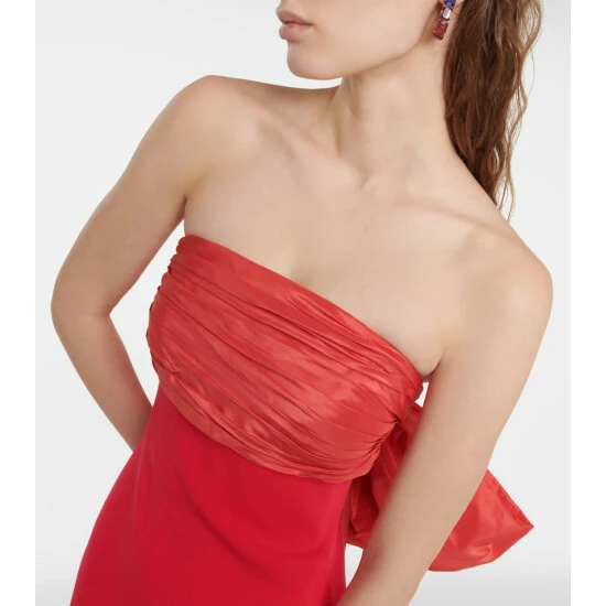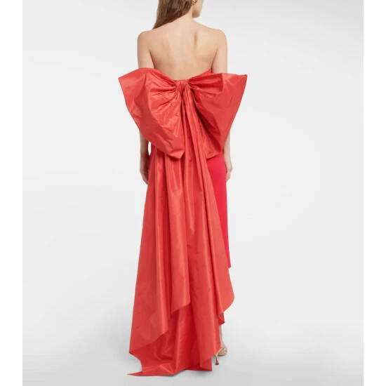 The gown showcases Oscar de la Renta’s cinematic vision. This Old Hollywood-esque piece is a dimensional design that’s trimmed with satin and features a ruched bandeau neckline, rear bow, and draped hem.