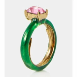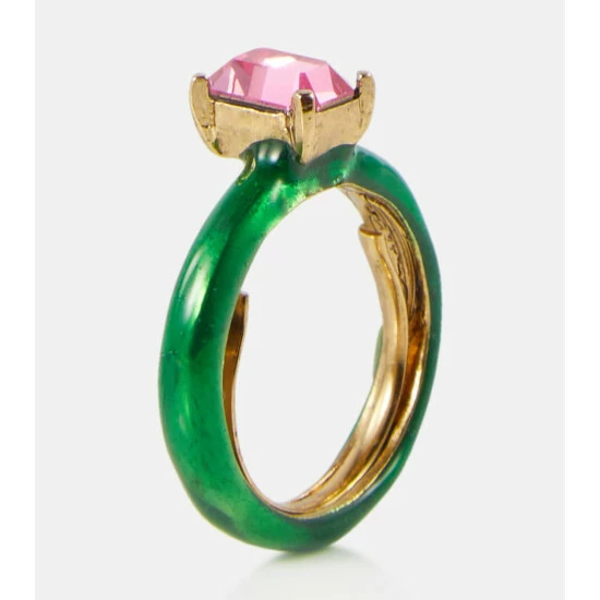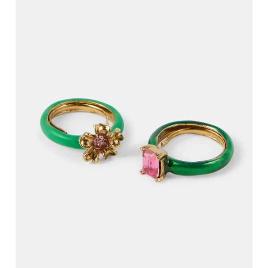 Designed to be stacked, but perfectly dazzling on their own, this set of two rings from Oscar de la Renta fuses colorful bands with crystal embellishments. One band sports a classic baguette crystal while the other takes on a delicate floral design.