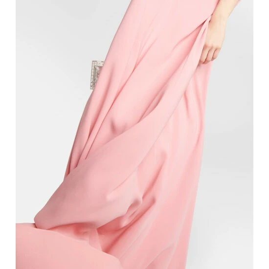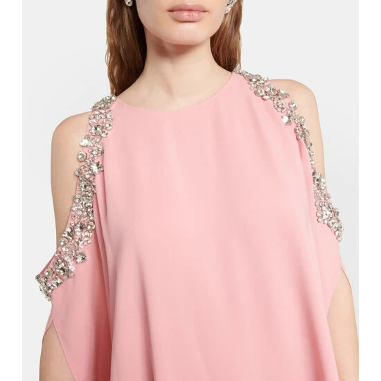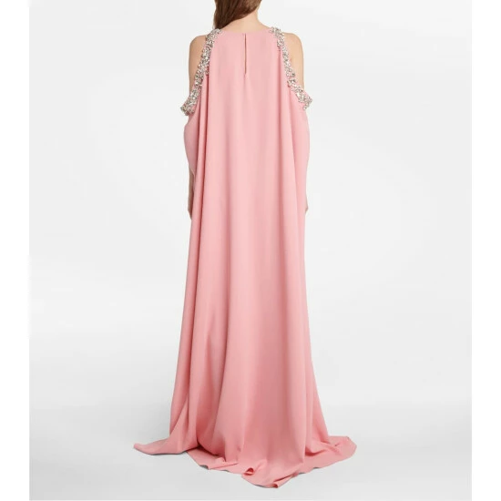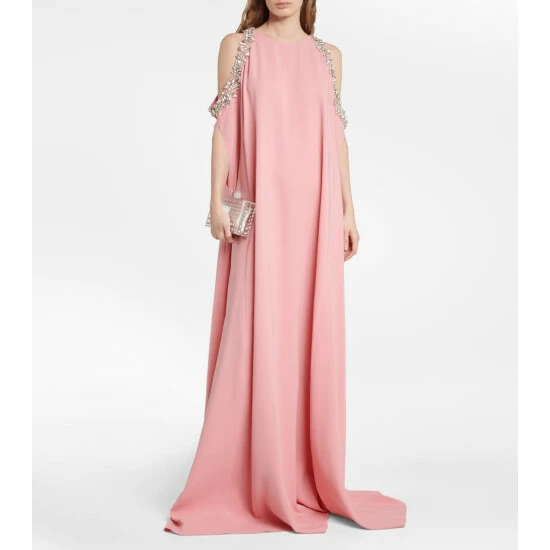 Oscar de la Renta presents another regal design with this floor-length pale pink kaftan. Made from a beautiful silk blend, this piece features open-shoulders framed by embroidered crystal embellishments.