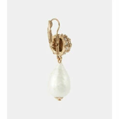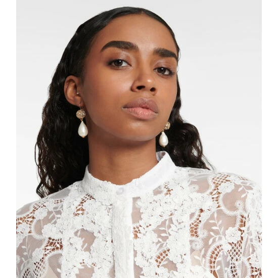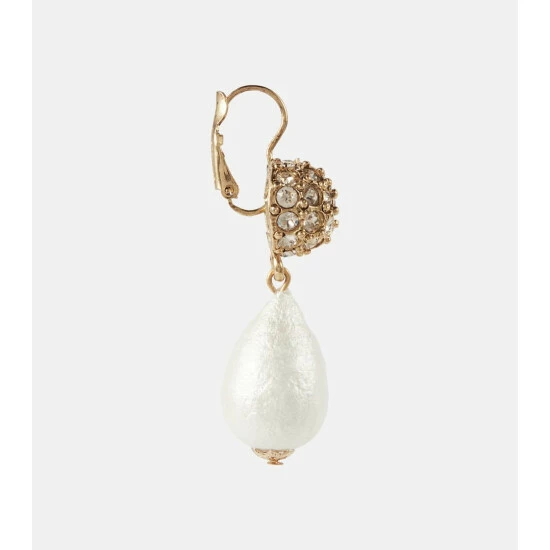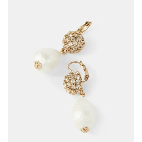 The Silk drop earrings from Oscar de la Renta achieve a timeless quality with their heirloom-inspired design. Cotton pearls from Germany hang from gold-toned spheres encrusted with glass crystals from Austria and fasten with a clasp closure.