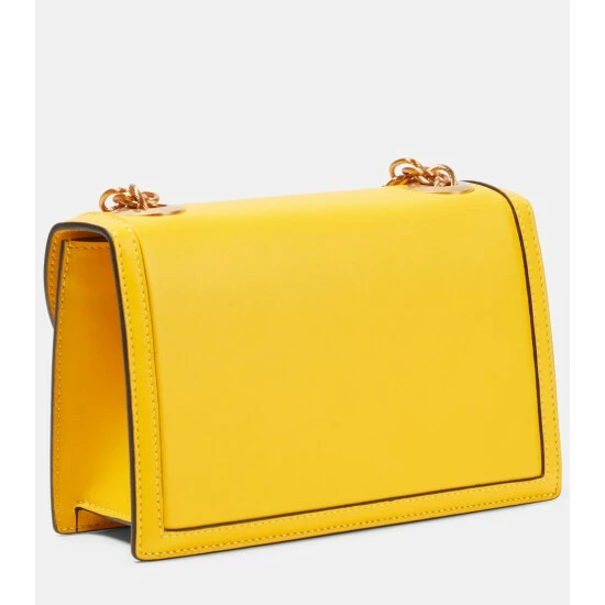 The Tro shoulder bag from Oscar de la Renta is the perfect accessory to complement the brand’s romantic dresses. Made from yellow leather, the structured design features a flower appliqué and chainlink shoulder strap.