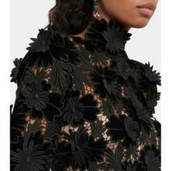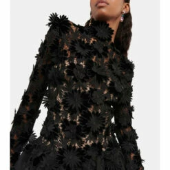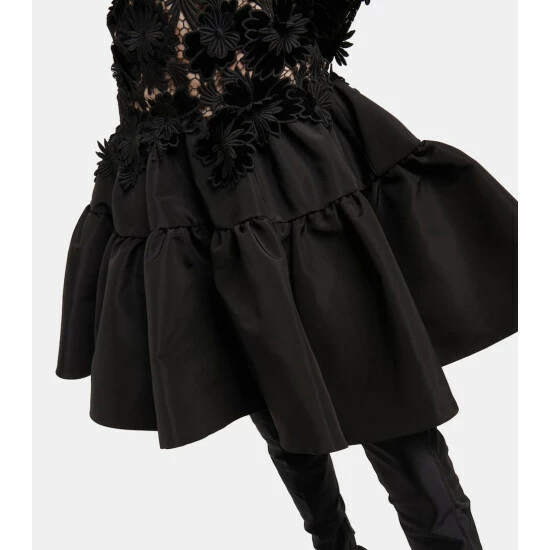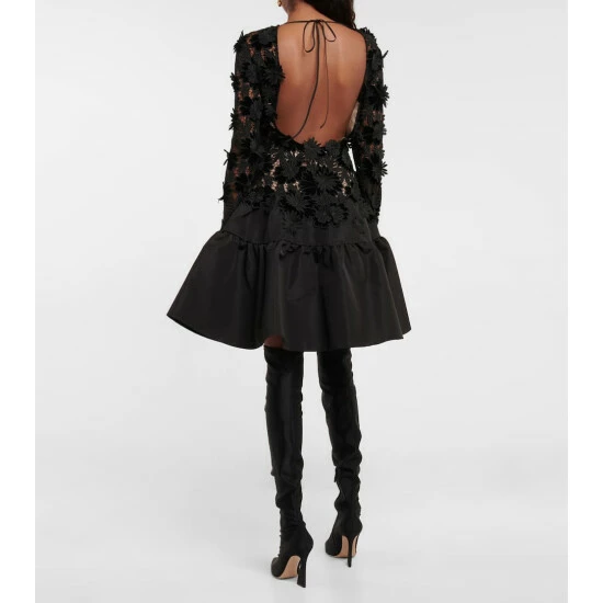 Made from semi-sheer guipure lace with floral appliqués this minidress from Oscar de la Renta has a high neck, long sleeves and a tiered A-line skirt.